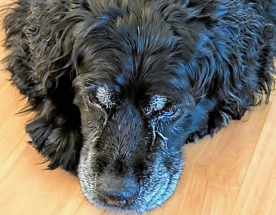 Image is a close-up photograph of a black American Cocker Spaniel lying on a wooden floor. The dog has a thick, wavy coat with a slightly graying muzzle, indicating age. Its eyes are partially closed, giving a relaxed expression.
