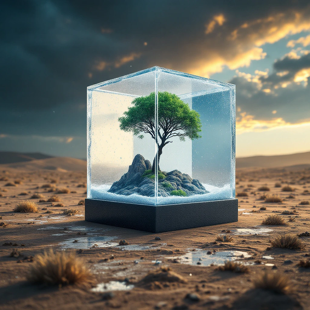 snow globe shaped like a cube , on the desert floor, there is a monsoon inside