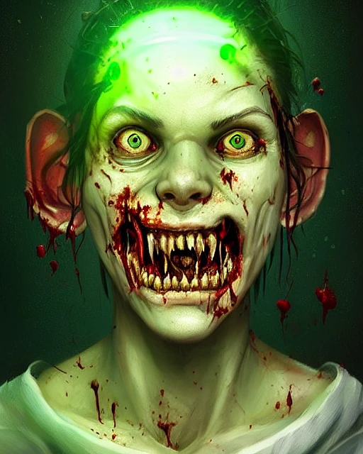 epic portrait cinematic shot an zombie scientist smilling and floating, laboratory backround, glowing red eyes, sharp smile, long teeth, creepy, green skin, fine details. night setting. realistic shaded lighting poster by craig mullism, artgerm, jeremy lipkin and michael garmash, unreal engine, radiant light, detailed and intricate environment, digital art, trending on art station,