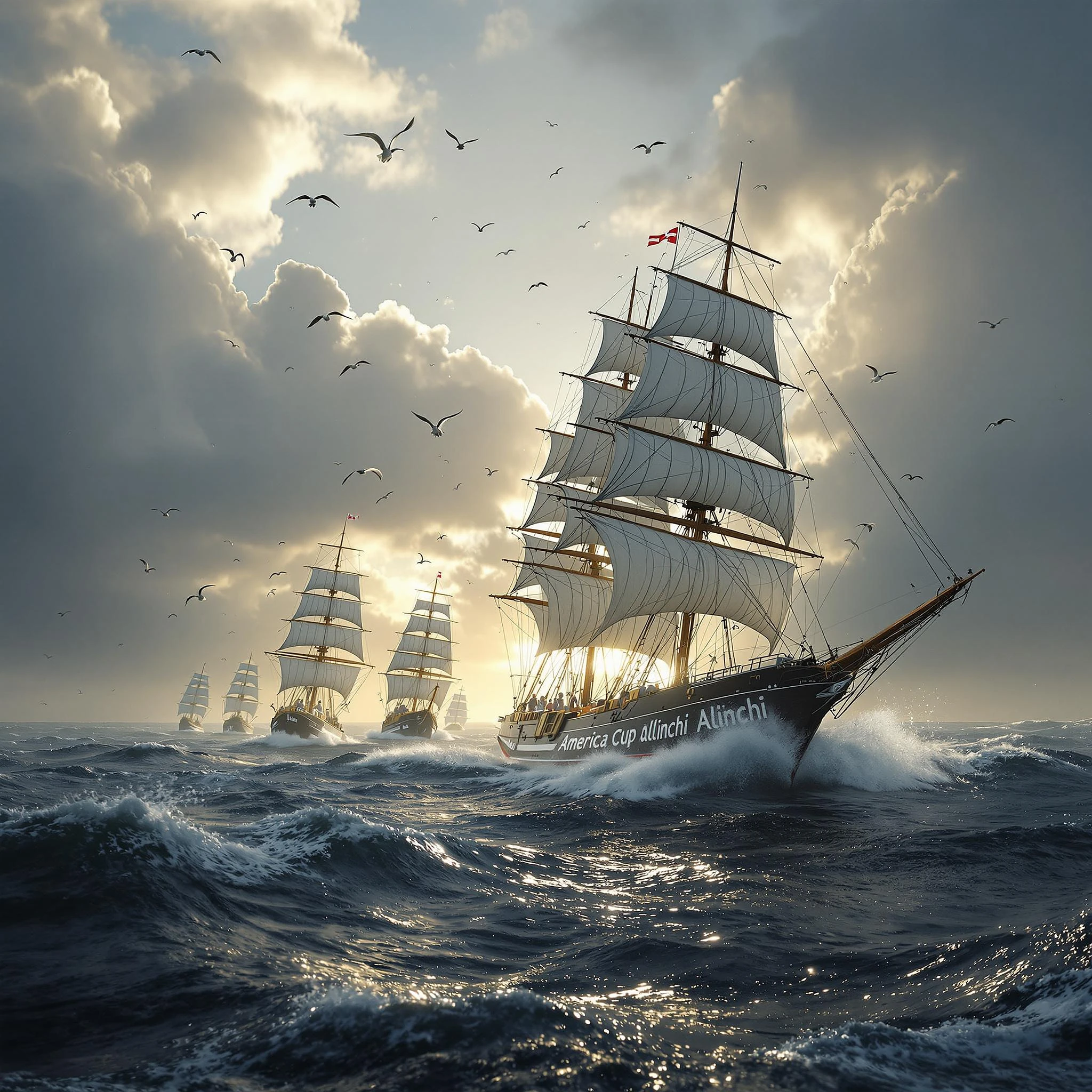 Photo of a ultra realistic Americas Cup racing ship Alinchi, dramatic light, pale sunrise, high seas, cloudy skies with the wind howling, and fish jumping out of the water, sea birds overhead coming directly at us, other racing ships following, cinematic lighting, battered, low angle, trending on artstation, 4k, hyper realistic, focused, extreme details, unreal engine 5, cinematic, masterpiece, intricate artwork byThe Dutch masters.