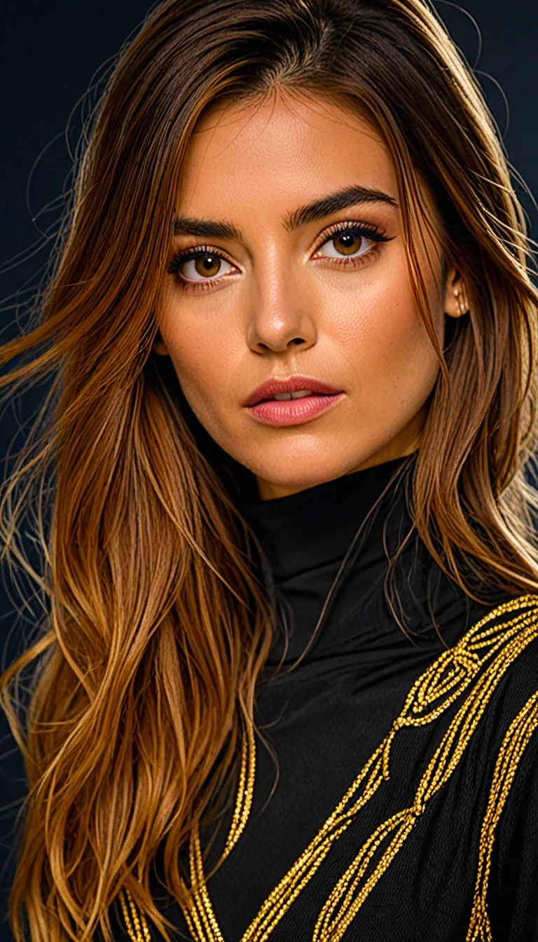 A detailed portrait of a woman with long, wavy hair that has a gradient from dark brown to light brown. Her facial features are sharply defined with prominent eyebrows, full eyelashes, and captivating hazel eyes. Her makeup is elegant and natural, complemented by soft rose lipstick. She is dressed in a sophisticated high-neck black top adorned with elaborate gold chain-like embroidery on the shoulders.