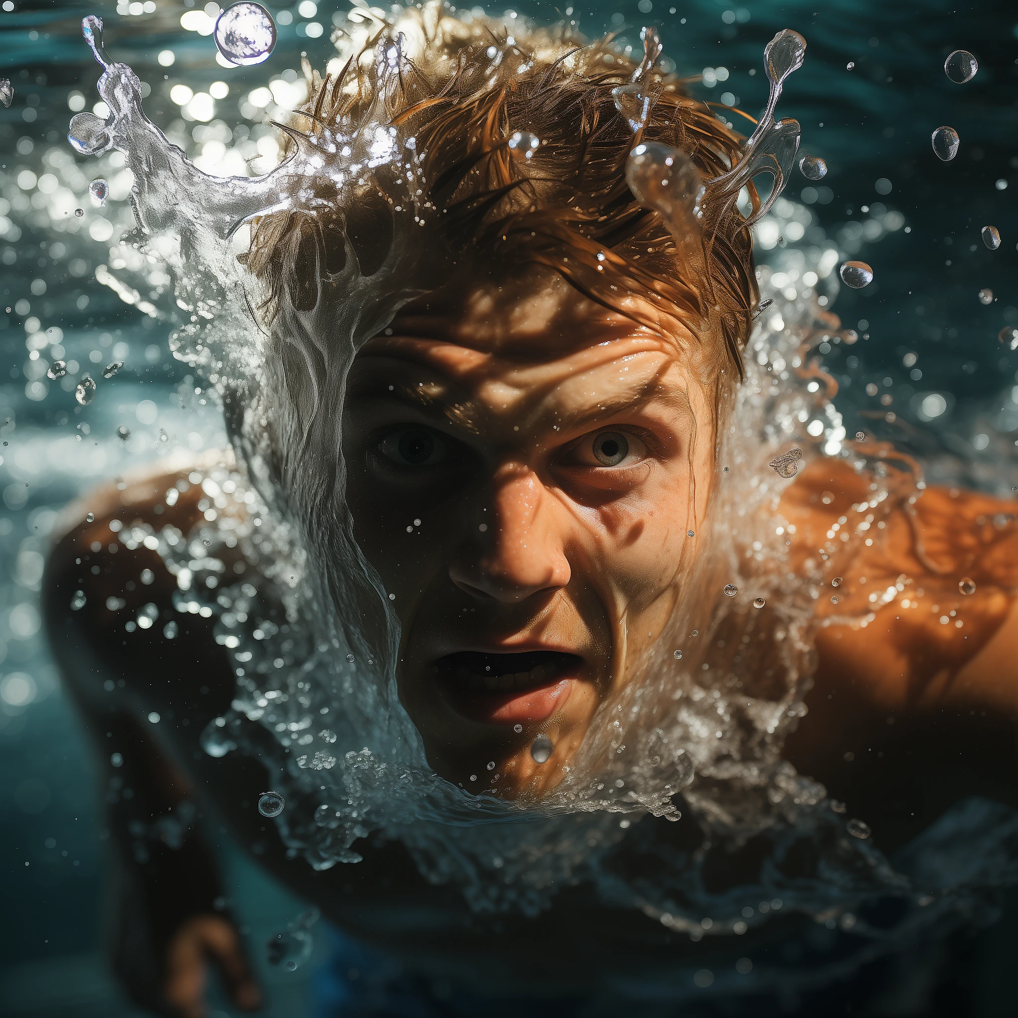 an up-close and intensely detailed scene of a swimmer slicing through crystal-clear water. The perspective is just beneath the surface, capturing the swimmer's face and shoulders in hyper-realistic detail as they pull through the water