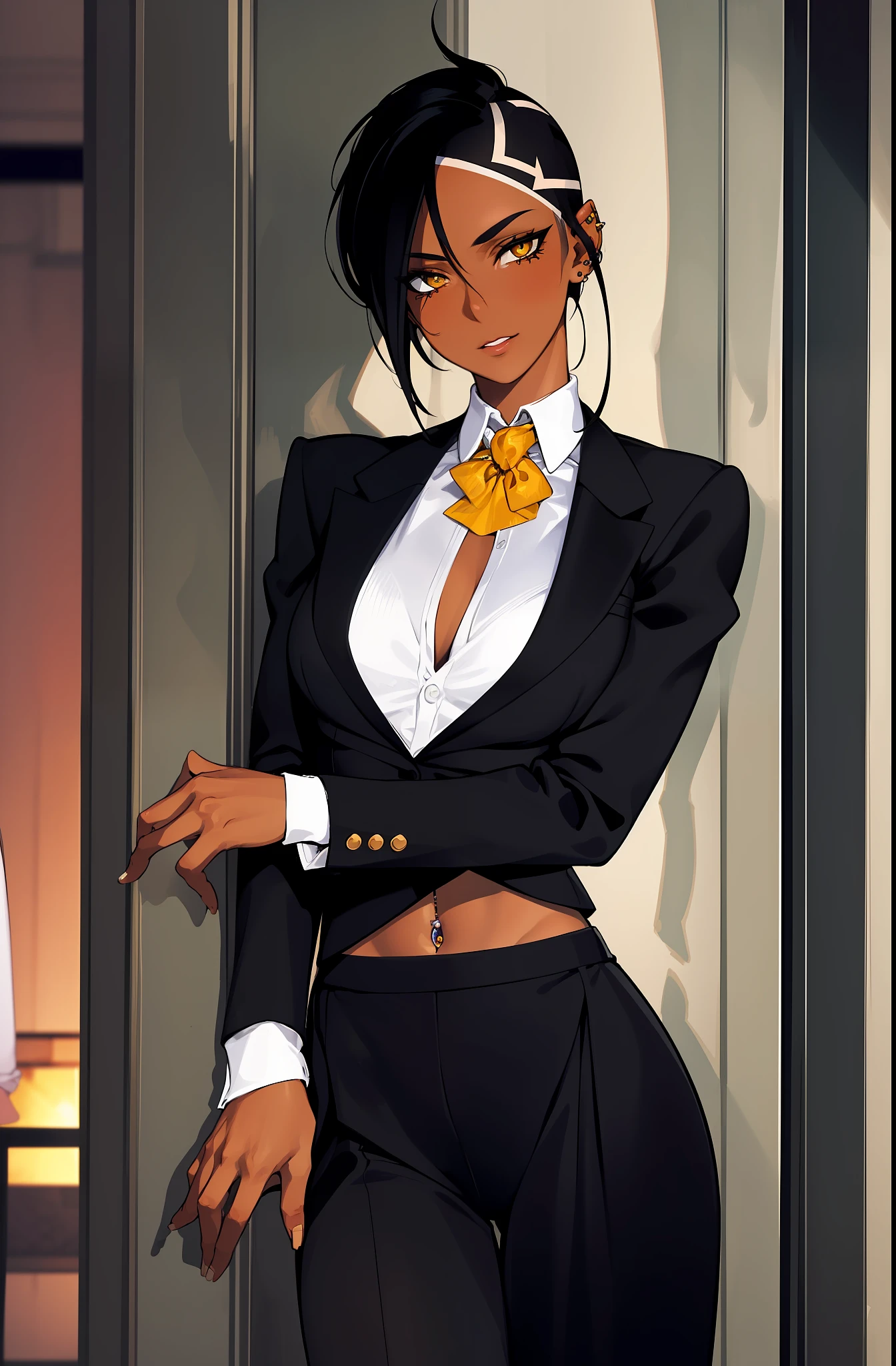 Solo, top quality, masterpiece, highly detailed CG, highly detailed 8K wallpaper, bird's eye view, highly detailed character, upright and immovable, front facing (very delicate and beautiful portrait) , tuxedo jacket opens front, black Slacks, zipper open, underwear shift, see-through bra, portrait, solo, clear focus, (((side shaved hair) )), dark-skinned tomboy, female butler, navel piercing, tattoo under the eyes, short hair, yellow eyes, detailed close-up portrait,