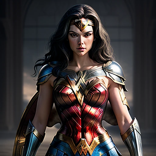 kneeling wonder woman lion knight, portrait, finely detailed armor, intricate design, silver, silk, cinematic lighting, dramatic lighting, 4k