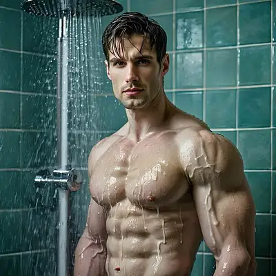1955, pin-up man, RAW photo, Irish man posing, flexing muscles, 45 years old, handsome face, standing naked in gym shoes in erotic position with three other men, wet face, medium dark hair, loose upper body, wearing swimming trunks, large bulge in shorts, HDR, 35mm lens, f2. 8, highly detailed, photoshoot, backlit, full length view, sharp focus, epic composition, photorealistic, maximum texture, highly detailed skin, 8K UHD, DSLR, soft lighting, high quality, film grain, Fujifilm XT3, highly detailed, photorealistic, high resolution, hyperrealism, cinematic light