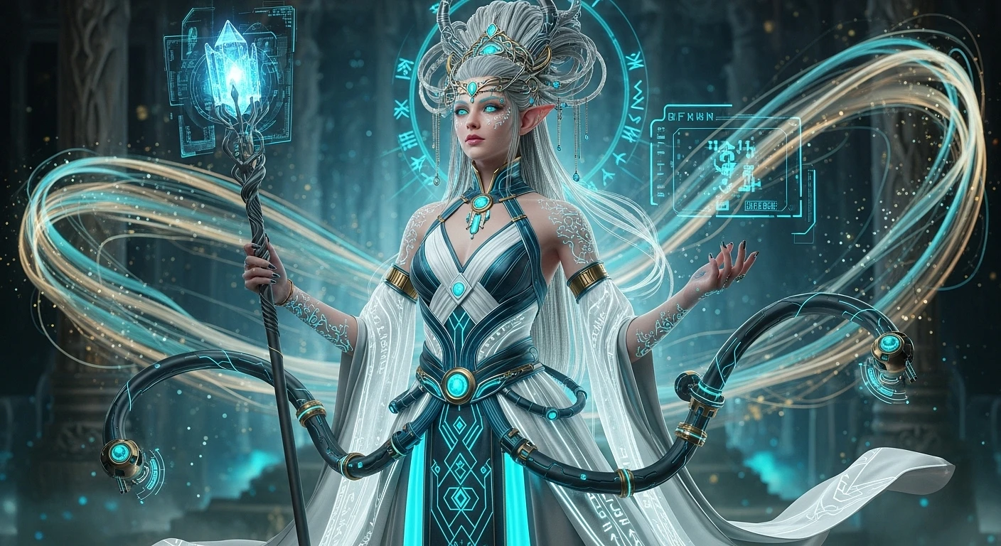 An ultra-realistic, full-body portrait of a captivating elven techno-priestess woman, her stance both serene and commanding, radiating a mix of ancient wisdom and futuristic power with a luminous and vibrant palette. She poses thoughtfully, her form exuding spiritual authority and technological innovation. She wears a modern, flowing gown crafted from luminescent silk interwoven with intricate circuitry and flexible, energy-infused fabrics, in a mix of deep turquoise, luminous white, and silver, with subtle gold and sapphire details, creating a stunning and ethereal contrast. The gown features intricate geometric patterns, elven runes, and flexible, energy-channeling devices, designed for both grace and technological manipulation. Her photorealistic face exudes tranquility and insight, with delicate features and piercing, turquoise eyes that glow with an inner light. Her long, silver hair is styled in a complex updo with interwoven fibre optic strands that seem to pulse with energy, adorned with delicate sapphire and gold headpieces. Ethereal, rune-like tattoos in glowing turquoise and silver patterns swirl along her arms and face, adding an elven, tech-infused charm. She holds a staff topped with a glowing crystal, its surface displaying shifting holographic symbols. The background is a vivid combination of ancient, elven ruins and swirling, abstract energy currents in hues of turquoise, silver, and gold, emphasizing her dynamic, spiritual, and technological power. Soft, ethereal lighting creates subtle shadows and luminous highlights, accentuating the graceful lines of her pose. The image combines advanced digital art techniques, including Cycles rendering, Blender sculpting, and Substance Painter detailing, with mixed-media digital painting. Every element is brought to life in 8K resolution, showcasing her as a powerful yet elegant elven techno-priestess, blending the aesthetics of fantasy, cyberpunk, and futuristic realism in one exceptional full-body scene.
