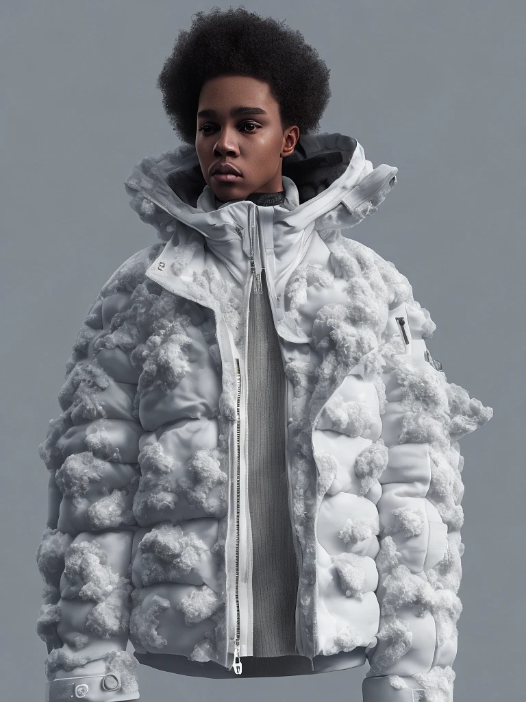 milky Fubu winter puffer jacket, design trend, design by kanye west, on a white background, octane, 4K, intricate and detailed texture --ar 4:5 --q 2