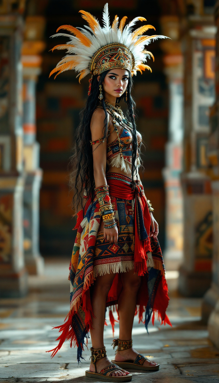 A photo of a 21-year-old Inca princess looking like Jenna Ortega, super exposing a woven tunic with vibrant geometric patterns, young, natural, feather headdress, platform sandals, hyper-realistic, 8K, skin imperfections, skin texture, mysterious eyes, in an Inca temple, UHD, ULTRA DETAILS. Hyper-realistic.