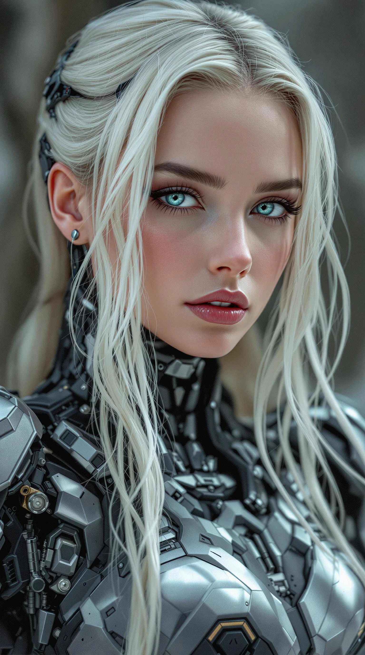 a professional photo of a exceptionally of the most beautiful girl in the world, (age 18) Jamie (futuristic) , (masterpiece) , (realistic) , (perfect anatomy) , (Full body) , head to toe, beautiful European brilliant Forest Tea Blue eyes, black eye liner, pink blush, dark pink eye shadows, small dimples on chin, long platinum blonde hair, futuristic background cyborg warrior in a heavily protected volumetric mechanical exoskeleton stands in a dynamic curved pose, dnd art, whimsical dark cyberpunk, sci-fi, mechanized precision, (4k,high res) , ultra-detailed, photo-realistic, full image view, full body view, front view