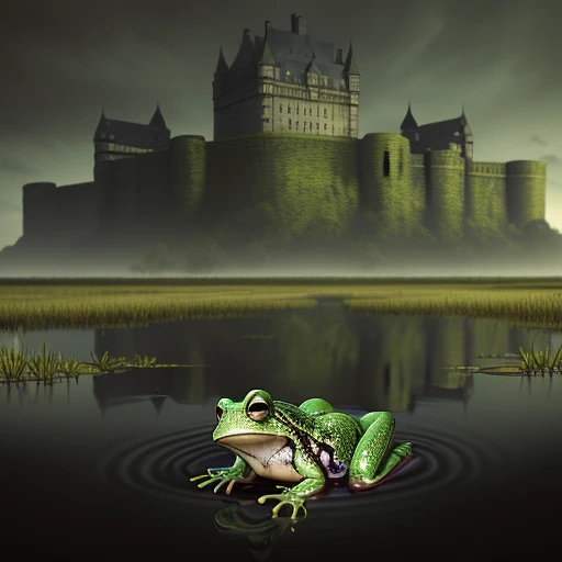 Hyper realistic frog in a Swamp, from the point of view a frog, fortress deep in the background The view is shot by a Nikon dslr with a 20mm.