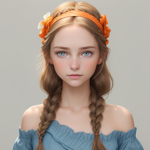 portrait of a young woman with a serene expression and delicate features. Her light brown hair is styled into a loose braid over one shoulder, and she wears a blue headband with orange floral patterns. She has clear, luminous skin and soft pale blue eyes that convey a gentle confidence. Her attire is casually elegant, with a relaxed blue denim garment. The lighting is soft and natural, enhancing the warmth and inviting quality of the portrait."