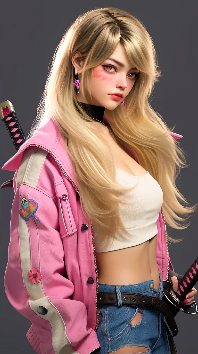Beautiful American lady with long blonde hair, pink jacket, blue denim, katana at the back, hyperrealism, photorealistic, 8k, unreal engine --ar 9:16 --niji 5 --style expressive --s 400