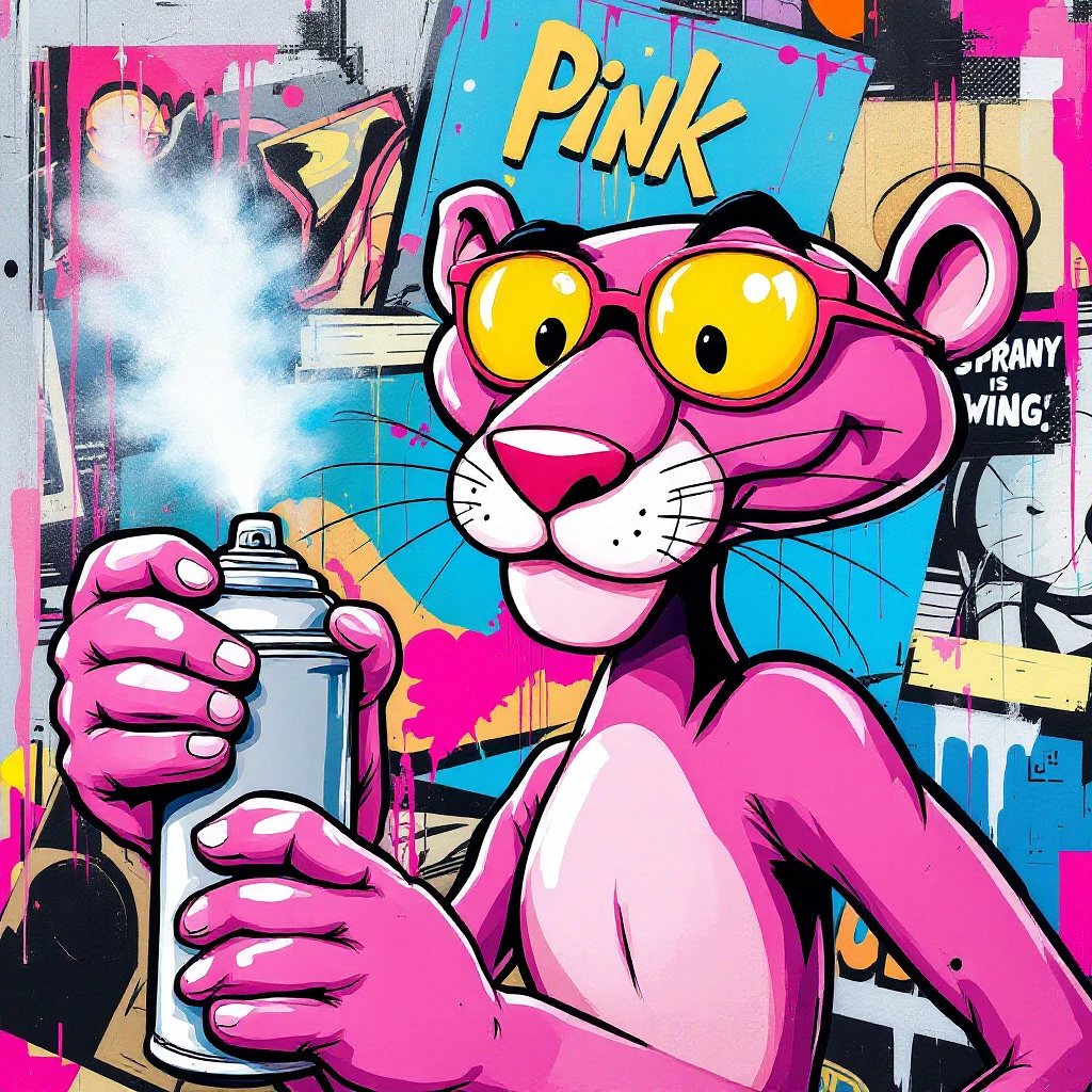 Pink Panther spray-painting, vibrant comic book style, cartoon character in bright pink, holding spray can, overlaid with vintage comic book panels, urban street art style, bold outlines, graffiti-influenced, mixed media artwork, intense pink and light grey, detailed facial expressions, dynamic pose, close-up perspective, graphic and energetic street art vibe, spray paint drips, retro comic book aesthetic, pop art style, highly stylized, 8k resolution --ar 1:1. 3 --q 2 --s 700