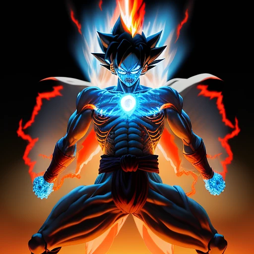 Skeleton Goku, in his Ultra Instinct form, is wrapped in blazing red, white, and light blue flames, which streak behind him as he soars through the air. His skeletal structure glows with an otherworldly aura, emphasizing the raw power pulsing within. With focused determination, he channels his energy into a formidable Kame Hame Ha, the luminous energy gathering at his palms before erupting into a dazzling beam that cuts through the sky with intense force, leaving behind a trail of scorching energy. The sheer magnitude of his attack resonates with an overwhelming sense of power and determination, making it clear that he is an unstoppable force to be reckoned with.