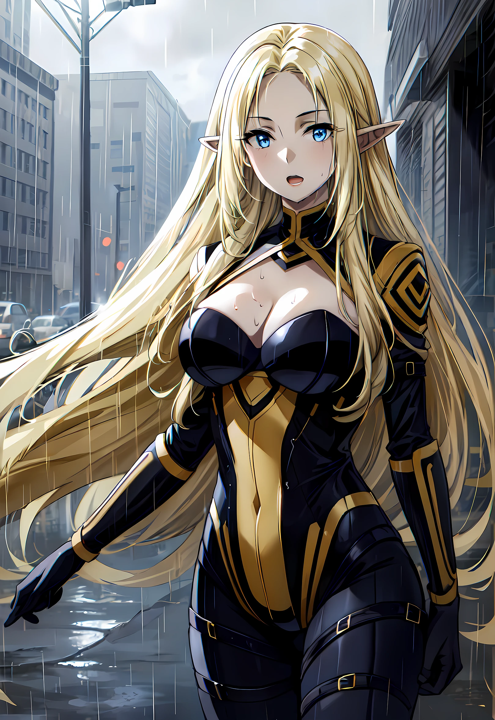 <lora:alpha:0.8> , single girl, solo, elf, upper body, very long hair , bangs, blonde hair, long hair, parted bangs, blue eyes, breasts, medium breasts, cleavage, open mouth, pointy ears, bodysuit, damp, wet, outdoors, city, (dimly lit:1.3) , rain, wind, sharp focus <lora:add_detail:1> , <lora:epiNoiseoffset_v2:1> , 16k, UHD, HDR, (Masterpiece:1.5) , (best quality:1.5)