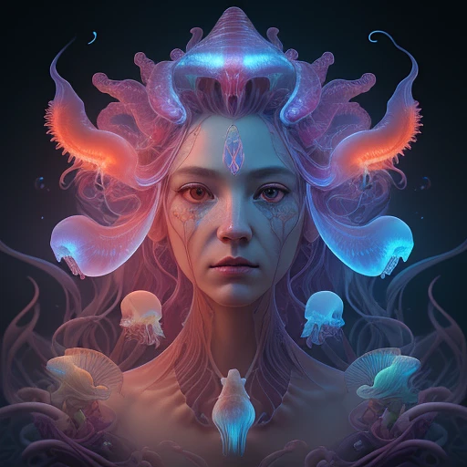 Goddess close-up portrait ribcagel. jellyfish phoenix head, nautilus, orchid, skull, betta fish, bioluminiscent creatures, intricate artwork . octane render, trending on artstation, t symmetrical artwork. cinematic, hyper realism, high detail, octane render, 8k