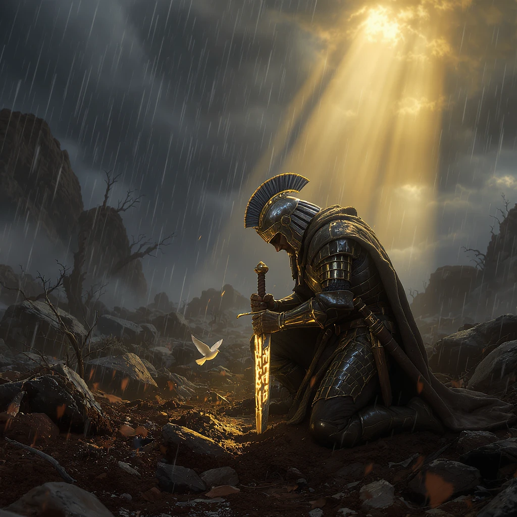 **powerful warrior, visually rich ancient egyptian warrior in armor** King James Bible verse tailored for, optimized to generate a **stunning, cinematic image** with deep emotional and symbolic weight: --- ### **🌄MASTERPIECE: "PSALM 46:10 – BE STILL"** **Prompt:** **"Be still, and know that I am God" (Psalm 46:10 KJV) – Ultra-detailed cinematic scene of a solitary warrior kneeling in a storm-swept valley at dawn, broken sword planted in the ground, as golden light pierces thunderclouds during sunset. Hyper-realistic, Unreal Engine 5 render, divine atmosphere, volumetric light, 8K. "** --- ### **🎨 KEY VISUAL ELEMENTS (For AI Precision) :** 1. **Subject**: A Warrior , battle-weary *in ancient egyptian armor with weapon** (mud-stained cloak) kneeling in surrender/posture of prayer. 2. **Setting**: - **Stormy Valley**: Rain-lashed rocks, dead trees, **war-torn battlefield** (smoldering ruins in distance) . - **Light**: A single **sunbeam** breaking through clouds, illuminating the egyptian warrior face (chiaroscuro contrast) . 3. **Symbolism**: - **Broken Egyptian Sword**: Embedded in earth like a cross, **reflecting the golden light**. - **Dove**: One lands on the knight’s shoulder (optional: **fading ghostly warriors** in the mist) . 4. **Style**: - **Renaissance painting meets modern cinematic realism** (think *Rembrandt lighting* + *Lord of the Rings* scale) . - **Textures**: Wet egyptian armor, swirling fog, **crumbling parchment with Psalm 46:10 etched in glowing letters**. --- ### **⚙️ TECHNICAL SPECS FOR PROMPTHERO:** "Ultra-detailed 8K render, Unreal Engine 5, cinematic wide shot, f/1. 4 depth of field, hyper-realistic textures (skin, metal, rain) , volumetric god rays, dramatic shadows, Renaissance chiaroscuro, --ar 16:9 --style raw --v 6. 0" --- ### **💡 ALTERNATE VERSES (If You Prefer) :** 1. **"The Lord is my shepherd" (Psalm 23:1) ** → Peaceful pasture with **luminous guardian-angel silhouette** over a flock. 2. **"Let there be light" (Genesis 1:3) ** → **Big Bang creation scene**, galaxies swirling from a divine hand. 3. **"Fearfully and wonderfully made" (Psalm 139:14) ** → **Human DNA as a glowing cosmic tree**, roots in stardust. --- ### **🎥 SHORT VIDEO SCRIPT IDEA:** - **Opening**: Lightning cracks over the battlefield; the knight **drops his sword**. - **Climax**: The sunbeam hits—**storm stills**, rain hangs frozen mid-air. - **Text Overlay Blending Through The Sun Light**: *"Be still, and know that I am God. "* **JDHampton + AI Creative Alliance** tag.