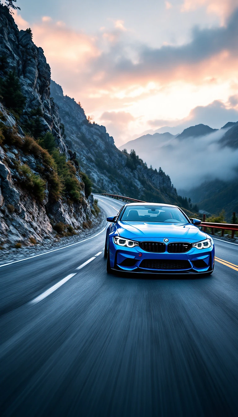 A sporty, bright-blue BMW M3 navigates a series of tight curves on a mountain road, the brakes glowing red, its engine roaring as it powers out of each turn, with a dynamic tracking shot showcasing its agility and precision.
