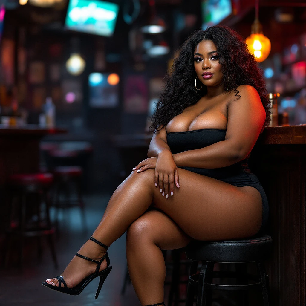 high definition, extreme detail, portrait photo, a beautiful, thick, full figured, mature, busty, light skinned Black woman sitting on a bar stool at a local dive bar. She's wearing a tube dress and crossing her legs to accent her beautiful calves. Wearing black strappy stilettos. --ar 1:2
