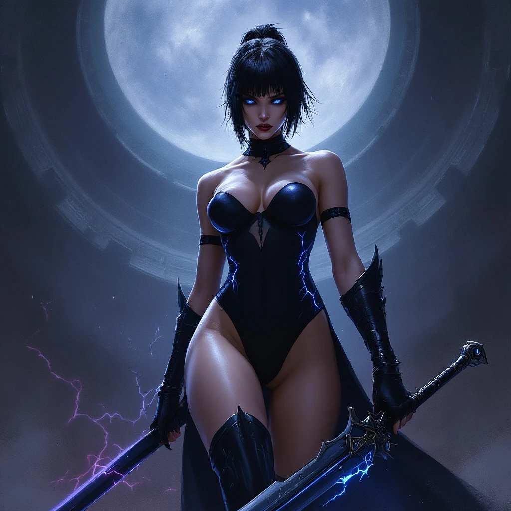 minimalistic painting in the style of warhammer 40k of a female comissar, standing infront a gothic circh, holding a sabre with blue lightning, cybereyes, black ultra tight onepiece bathsuit, black sidecut hair, huge dd tits