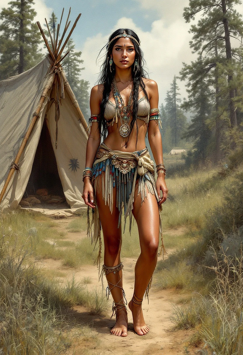 Full body view of A half colored draw of a real beautiful native american indian woman, no hedgear, realistic, hyper detailled, full body, barefoot (((show foot) )) back ground is an american indian camp