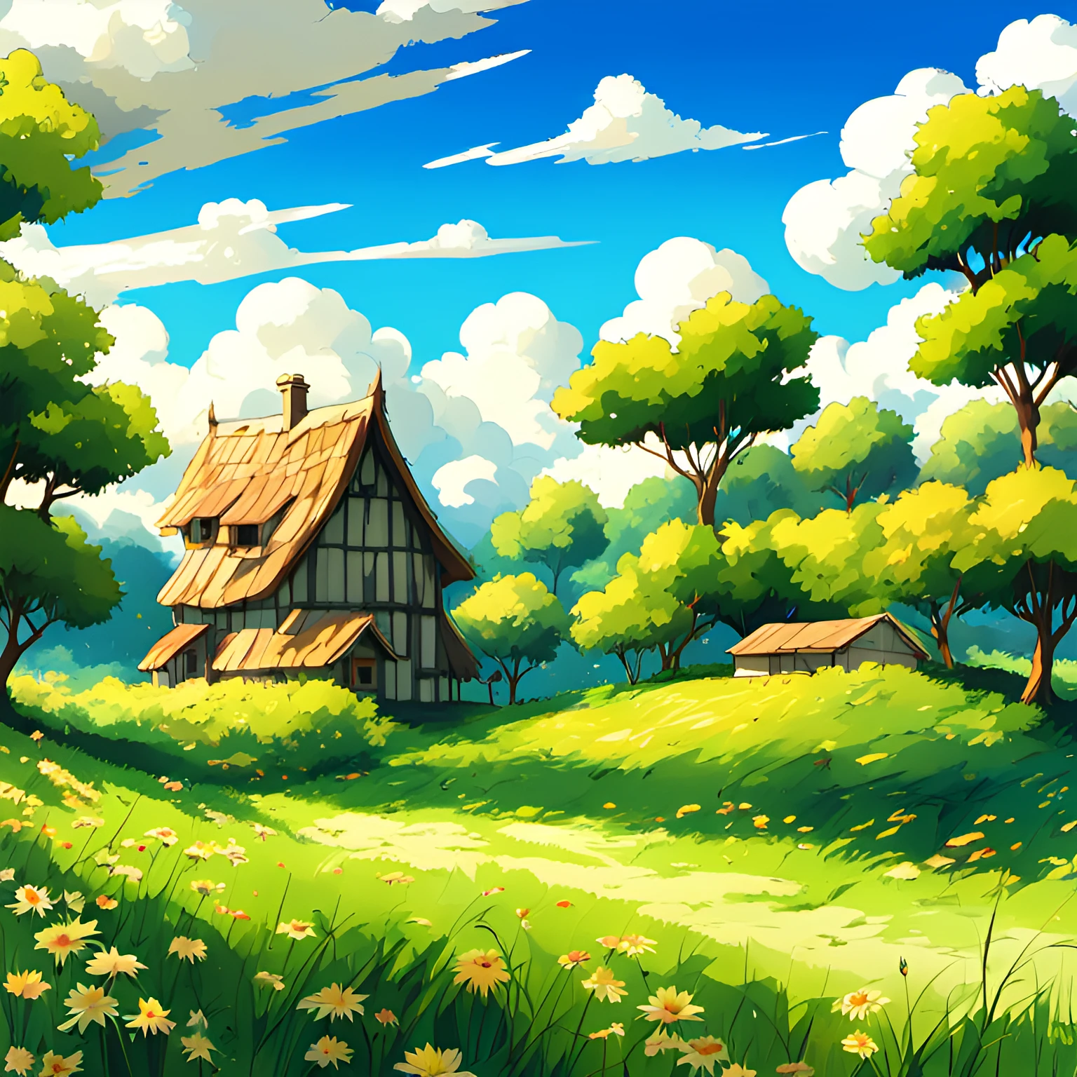 master piece, anime landscape, inspire from your name anime, Nij, (a beautiful grass filed) , fluffy clouds, (day:1.3) , wind flow through the grass, a beautiful house middle of the field