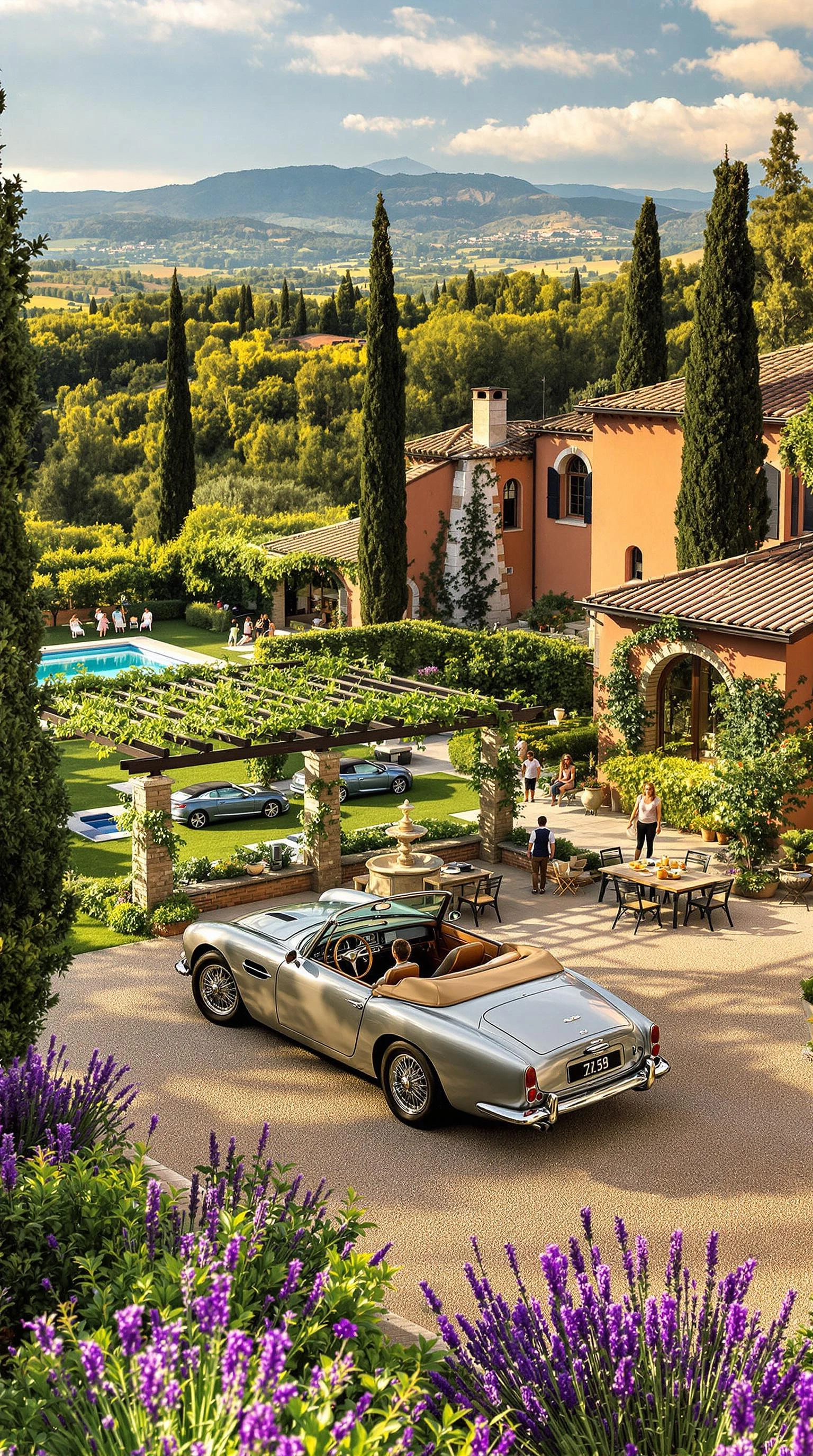 "A breathtaking villa surrounded by rolling hills, olive groves, and vineyards bathed in golden sunlight in Tuscany. The villa is a traditional Italian farmhouse with warm terracotta walls, rustic wooden beams, and large arched windows. A gravel driveway leads to a beautiful courtyard with a stone fountain. A vintage classic silver grey Aston Martin convertible sports car is parked. Lush greenery, tall cypress trees, and vibrant lavender bushes frame the landscape. A happy couple, stylish and relaxed, enjoys an outdoor breakfast on a wooden table under a pergola, draped in vines, while their two young children play on the lawn. In the distance, a blue swimming pool glisten. DJ decks with turntables and speakers are set up for an evening of music and romance under the stars. The atmosphere is serene, elegant, and effortlessly luxurious, capturing the essence of a dream life in the Italian country side. "