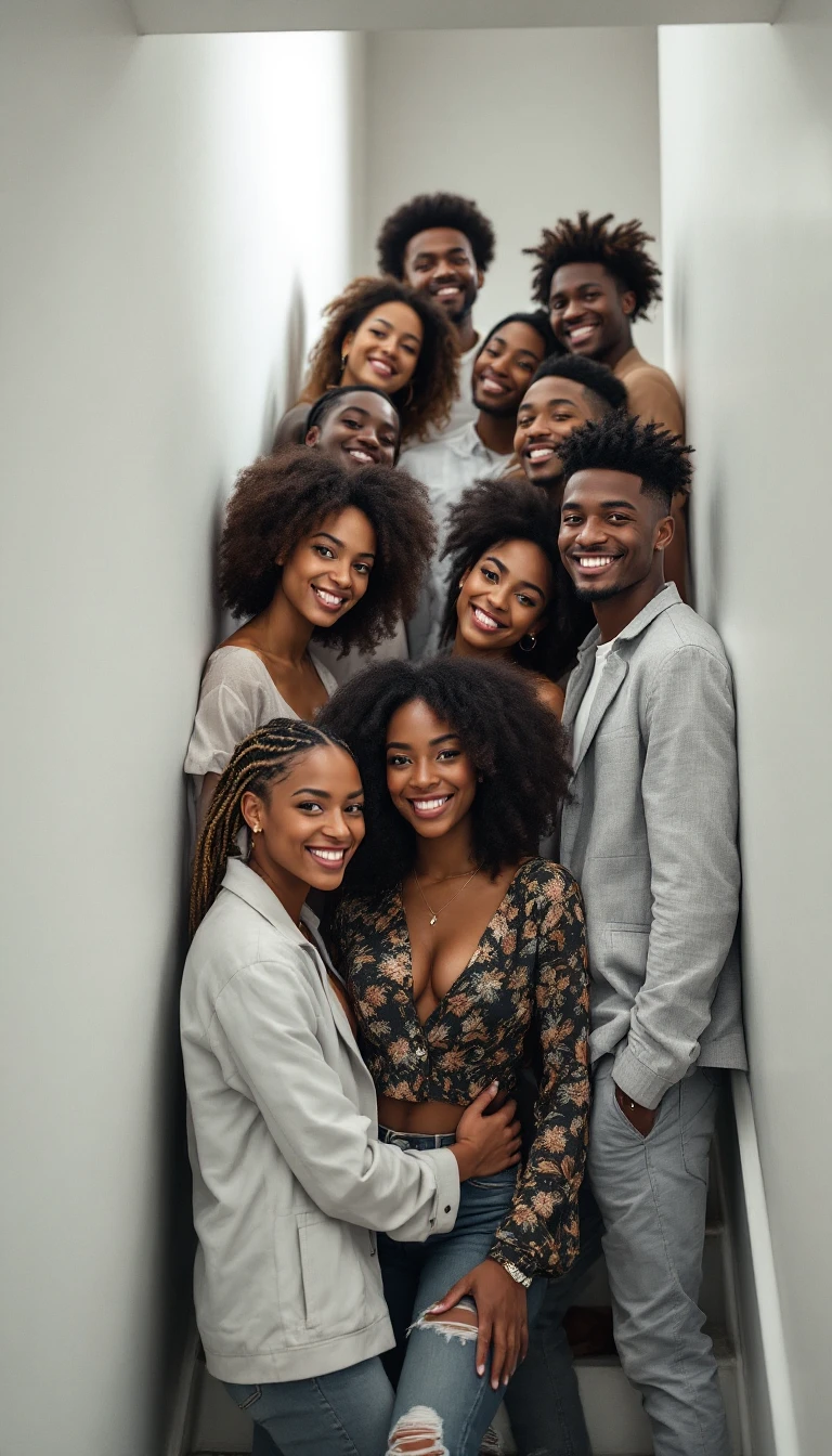 Photo of a ultra 8 realistic mixed race friends, mostly black people, in a tight white modern stairway, men and women, facing the camera, smiling, fashionable, in the style of hyper-realistic National Geographic photography, expressive, hyperrealism, photorealistic, detailed hair, hyper detail, cinematic lighting --ar 1:2 --stylize 750