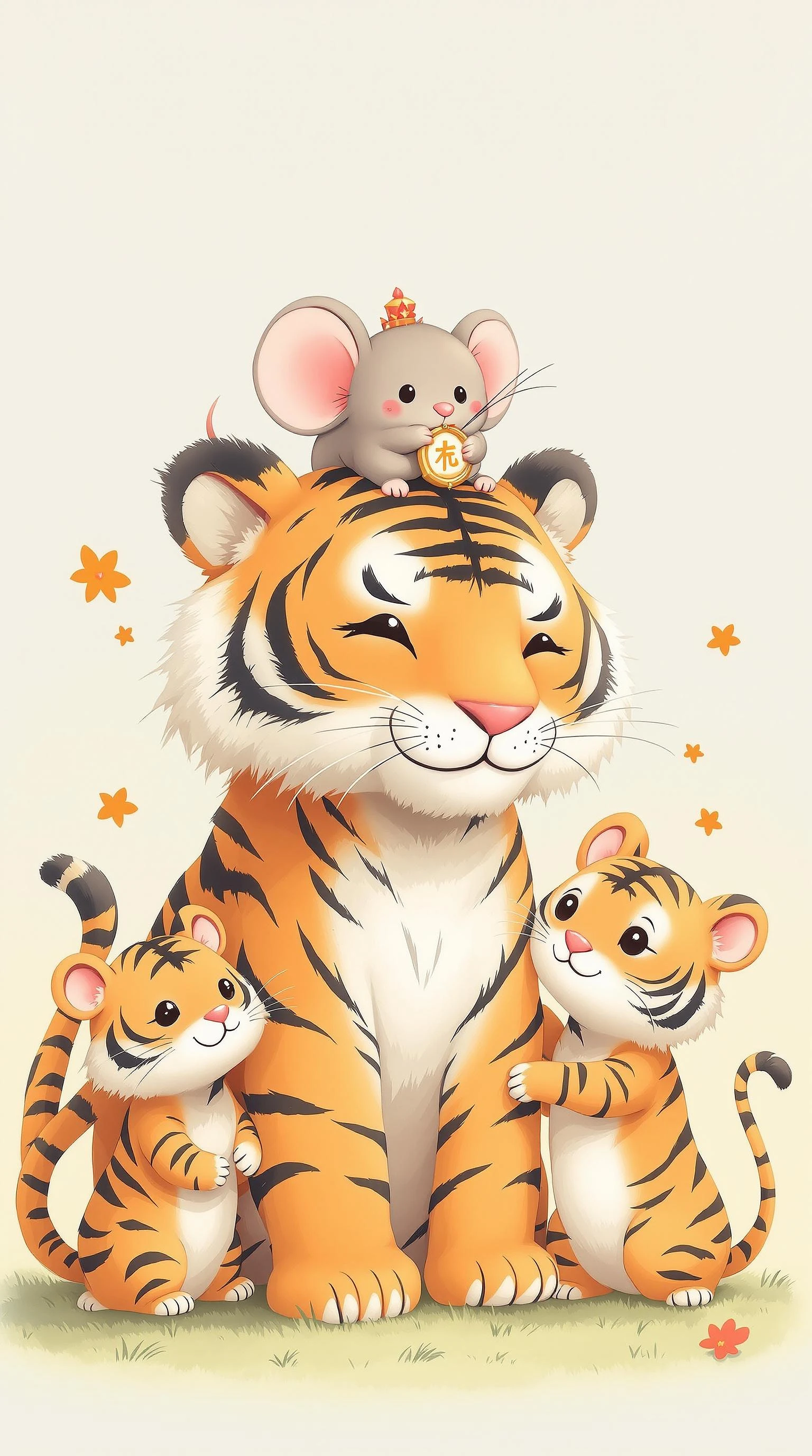 kawaii art, a tiger and two tiger cubs, and a oversized mouse , with a mouse on the tiger's head, the mouse holding a talisman,