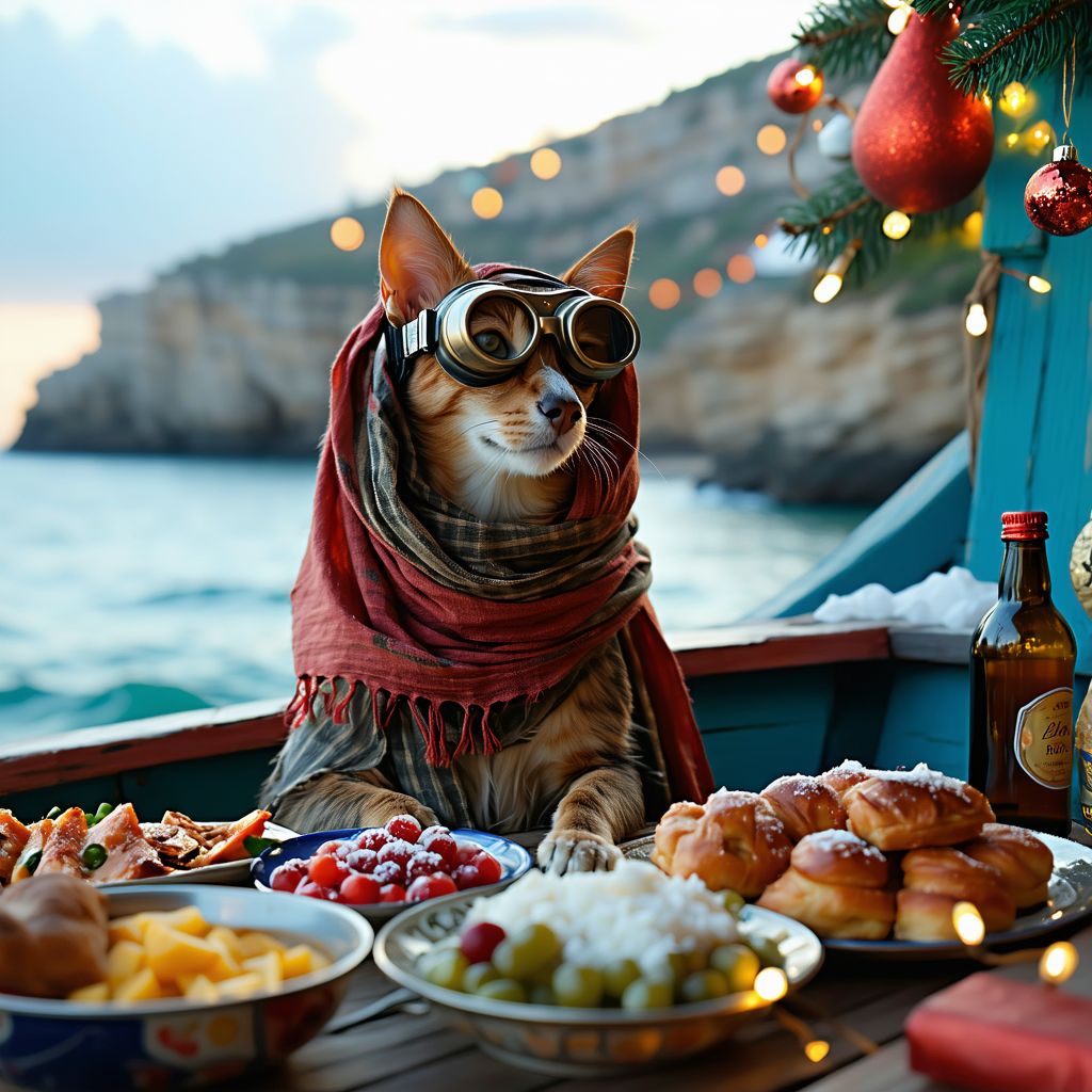 imagine a funny festival dog with googles and a pashmina over its head sitting in a fishing boat, Matala beach in the background and the sea, The boat has Christmas lights and lots of food on the table in front of the cat., realistic photography style raw, editorial photography, chiaroscuro , Sony Alpha IV, Kodak Color 35mm, in the style of 32K raw, UHD. mixture of cyberpunk and steampunk
