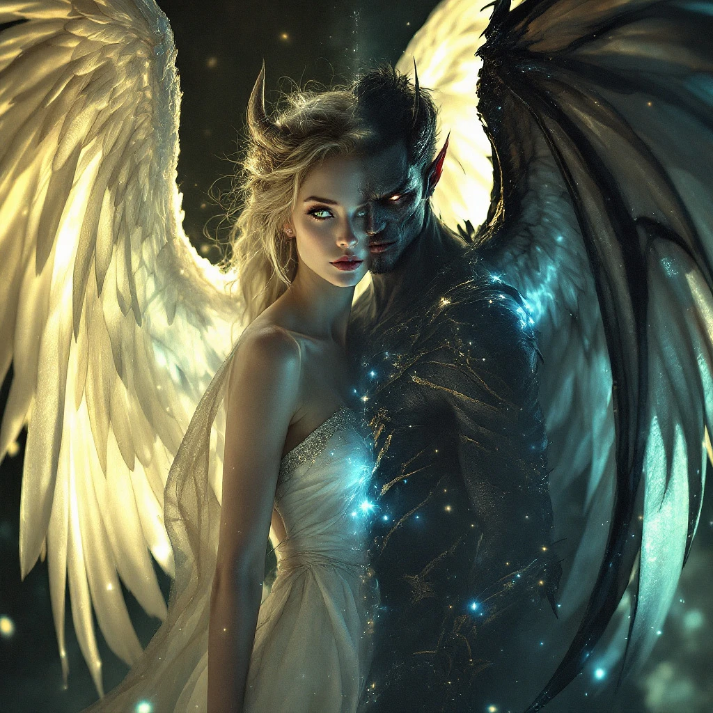 Create an award-winning portrait of an angel and a demon, capturing the eternal contrast between light and darkness, virtue and temptation. The composition should be strikingly balanced, with the angel exuding celestial grace and the demon radiating a dark, alluring power. The angel should have soft, ethereal features, glowing skin, and luminous eyes filled with wisdom and kindness. Their wings should be vast and radiant, shimmering with divine light—pristine white, golden, or iridescent with a surreal glow. Their attire should be flowing and elegant, like a celestial robe or armour of light, embodying purity and strength. The demon, in contrast, should be brooding and intense, with chiselled, shadowed features and smouldering, piercing eyes that hint at both danger and sorrow. Their wings should be dark and imposing—either tattered and bat-like or grand and raven-feathered. Their attire should be regal yet sinister, draped in deep reds, blacks, or metallic elements, evoking power and temptation. The background should create a dramatic, cinematic atmosphere—perhaps a stormy sky where light and shadow collide, a gothic cathedral bathed in divine and infernal energy, or a twilight battlefield where the forces of good and evil meet. The lighting should be masterful, with a glowing halo around the angel and flickering embers or shadows surrounding the demon, emphasising their duality. The artistic style should be hyper-realistic with fine-art fantasy elements, ensuring every detail—from the feathers of their wings to the emotion in their expressions—is breathtakingly lifelike. This portrait should be a visually stunning and emotionally charged masterpiece worthy of artistic accolades.