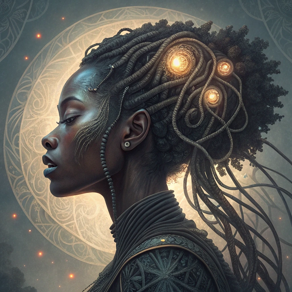 "Afro-Surrealist image of a Black woman with intricate braids intertwined with glowing circuits, representing the intersection of traditional culture and technology. "-surrealism, baroque pop, symmetrical composition, Mark Ryden and Romare Bearden style