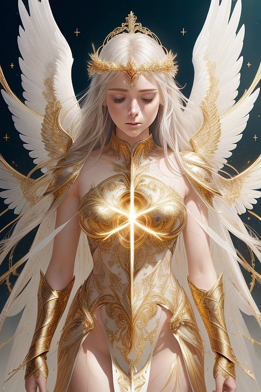 A visual stunning photography of an angel wearing gold and silver crystal armor, heaven background, glowing halo around head, golden hair, white feathered wings, | centered| key visual | intricate| highly detailed| breathtaking beauty| precise lineart| vibrant| comprehensive cinematic| Carne Griffiths| Conrad Roset, anna dittmann, dynamic pose, best quality, 8k, golden hour