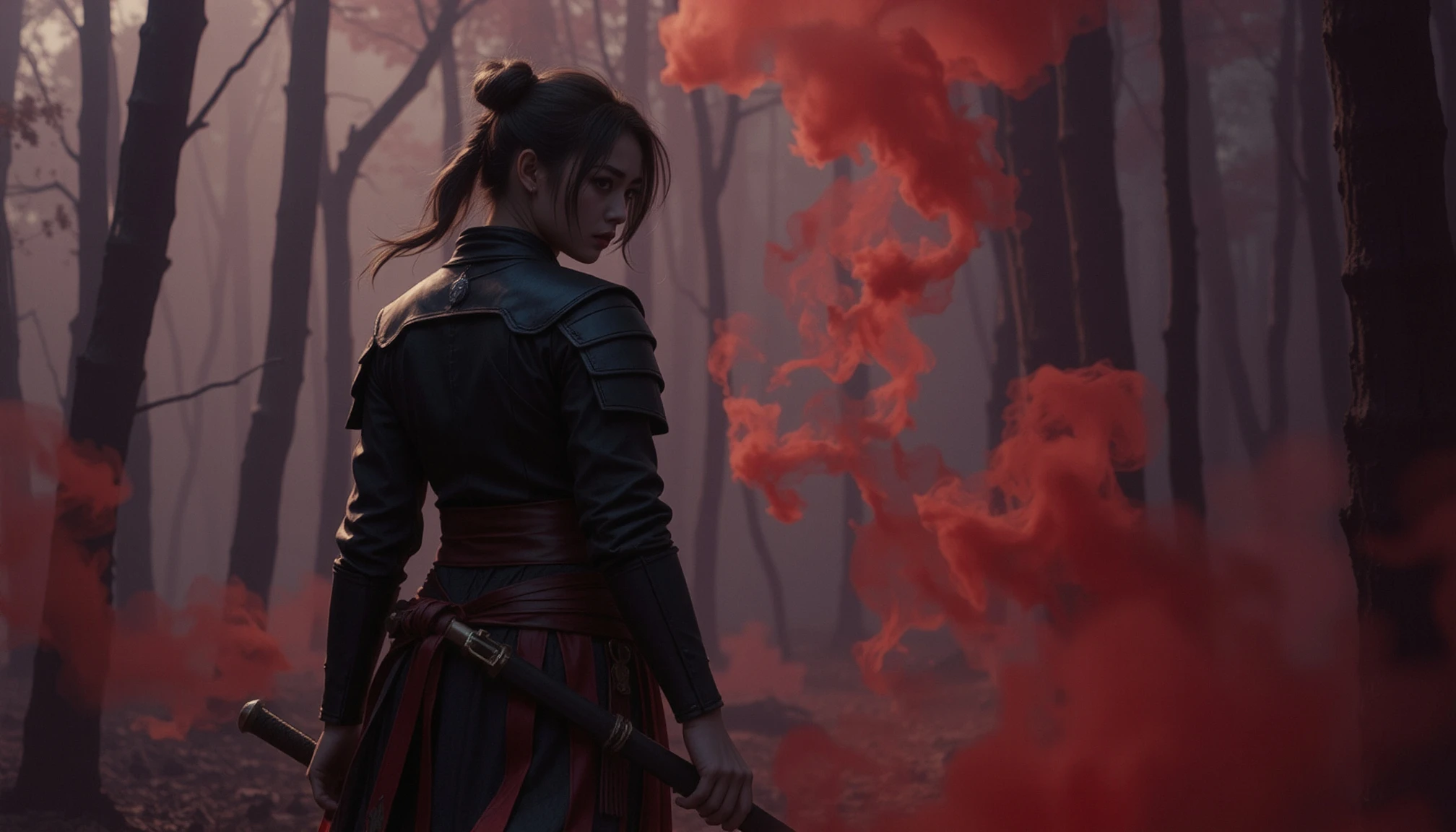 Asian girl with a single straight handle up katana sheathe, scabbard sealed, wistful, walking, resolutely through a dimly lit forest filled with red smoke, glancing back, dressed in intricate black and red samurai garb, gentle volumetric light, portrait photography, ultra-realistic, 8k.