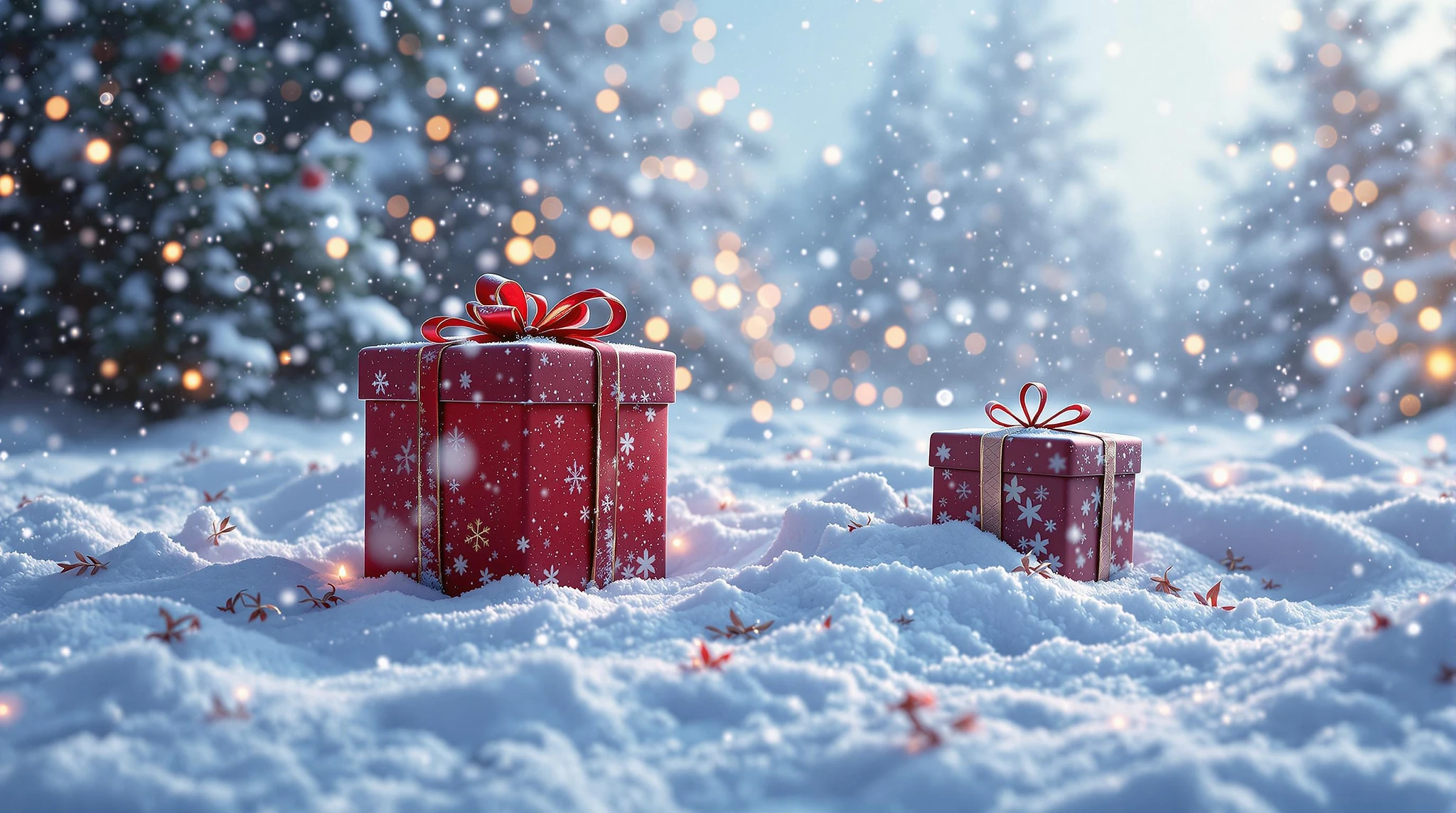 Photo of a snowstorm around New Year's gifts, dramatic light, New Year's mood, cinematic lighting, shabby, low angle, trending on artstation, 4k, hyperrealistic, focused, extreme details, unreal engine 5, cinematic, masterpiece, studio ghibli art, 2025 lettering, intricate work John William Turner