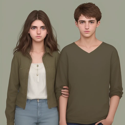 Aquí tienes un prompt detallado: "A woman and a man standing side by side, both in their late teens and early twenties. The woman is 18 years old, 1. 70 meters tall, with short brown hair, olive-green eyes, and an olive skin tone. She has a calm and serene expression, dressed in casual attire suitable for a cool day. Beside her stands a 22-year-old Abkhazian man with very dark black skin, short curly black hair, and deep black eyes. He is slightly taller, around 1. 75 meters, with a strong, confident stance. The background is a simple, neutral setting that emphasizes their contrasting yet harmonious appearances. "