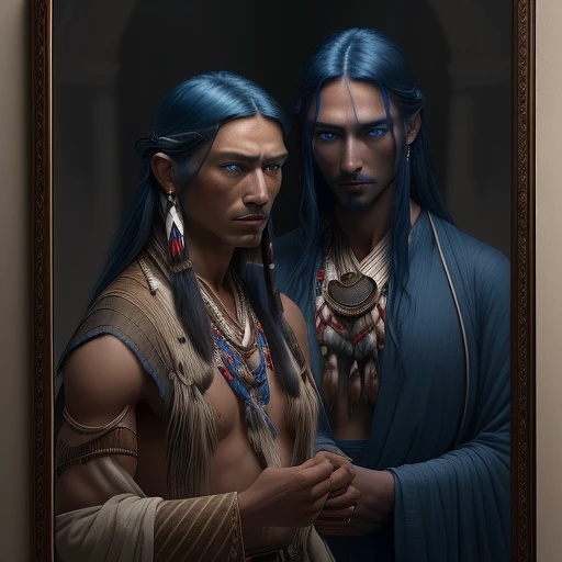 a photo of a man with blue eyes looking at herself, in the style of light indigo and dark amber, realistic hyper-detailed rendering, 32k uhd, orientalist, idealized native americans, intense close-ups, romantic fantasy --ar 7:8 --s 750 --v 5. 2