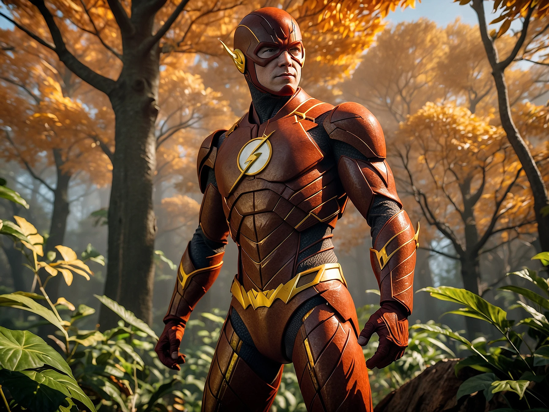 "The Flash is standing in a majestic forest filled with orange trees and leaves. He is wearing a full body armor suit that is predominantly black, with accents of gold and orange. The armor suit is highly detailed and hyper realistic, capturing every intricate design and texture. As the Flash stands tall, the leaves of the forest are gently falling, creating a mesmerizing visual effect as they gracefully land on his suit. The sunlight shines brightly on the armor, illuminating its vibrant colors and highlighting its impeccable craftsmanship. The overall scene is breathtaking and captivating, resembling an award-winning photograph. The image will be rendered in 8K resolution to showcase the finest level of detail and realism. "