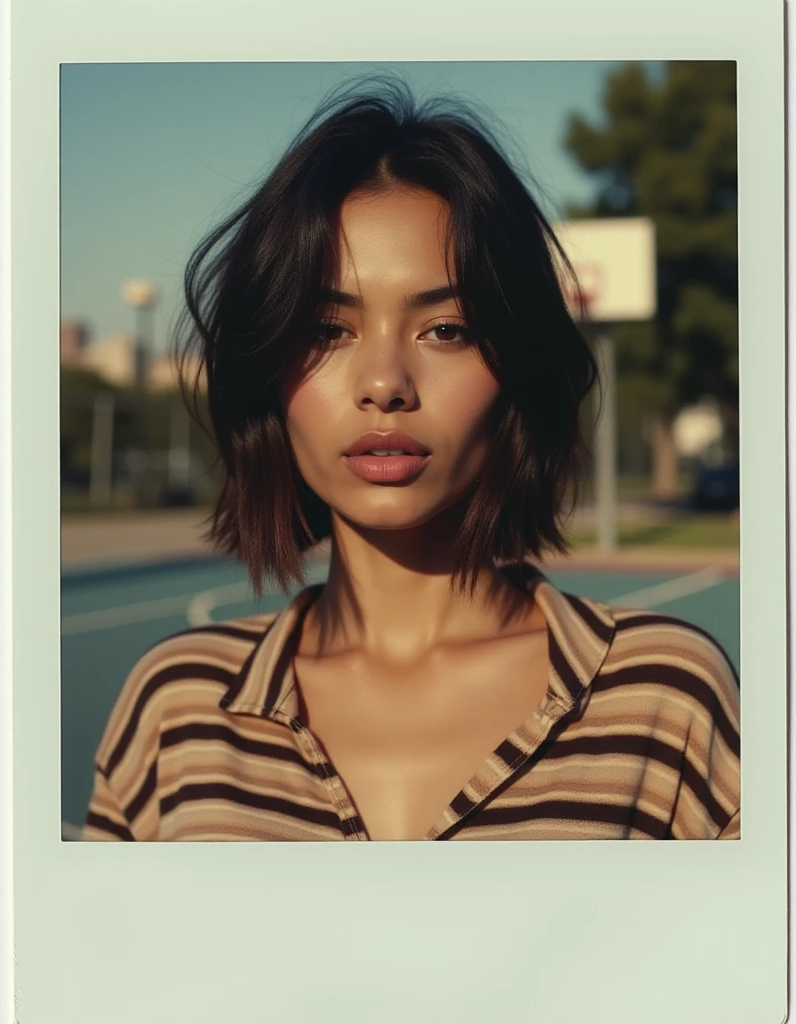 polaroid close up on face photo of a 24-year-old Mizo-Lebanese female exotic beauty with a warm and inviting expression. She has Medium-tan skin with a hint of olive, evenly bronzed from regular sun exposure. She wears subtle makeup, with a hint of blush on her cheeks and a natural pink shade on her lips, the skin pores and texture are clearly visible and in focus. Her Octagonal eyes, Gentle, deep brown eyes, framed by long, elegant eyelashes. Her Shaggy bob with tousled texture. Her eyebrows are neatly shaped, complementing her delicate facial features.