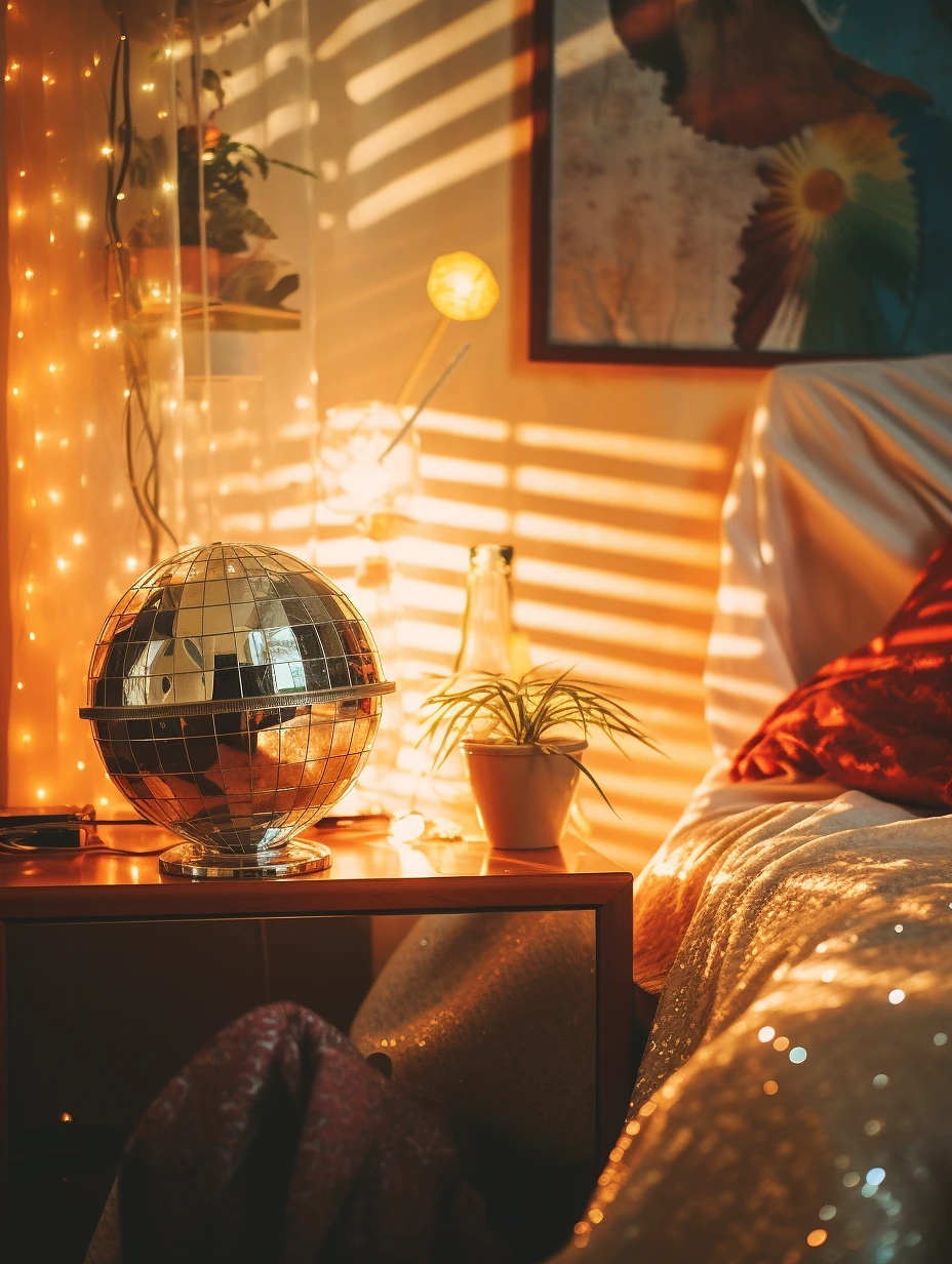 disposable photography of disco globe in the cozy room, 8k, photo realism, --ar 3:4