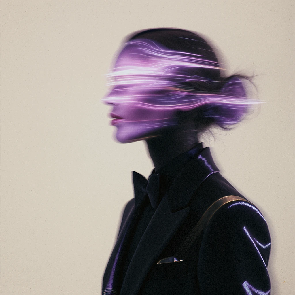 A surreal, faceless portrait of a person in elegant black-tie eveningwear, wearing a sleek tuxedo or glamorous black dress with glowing metallic accents. Their face is abstract or obscured in a motion-blur effect, as if dissolving into digital light. The fabric reflects soft purples, golds, or cosmic tones. The background is minimalist and flat, like warm beige or dusty pastel, with a subtle grainy texture. Stylised lighting creates an ethereal, futuristic feel. The overall look is modern, dreamlike, and fashion-forward — like a high-end editorial blended with glitch art and vaporwave tones.