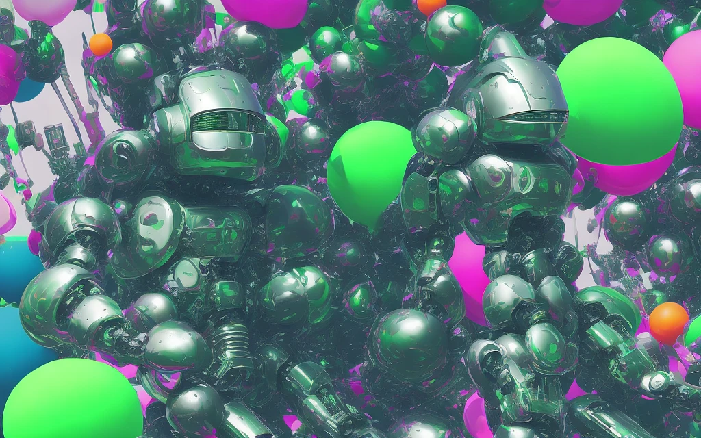 a close up of a poster with a robot sitting on top of a bunch of balloons, inspired by Mike Winkelmann, futuristic, strong body , metallic green armor, vector aesthetics, shattered visor, hyper colorful, banner, subatomic electrons! , from tv anime