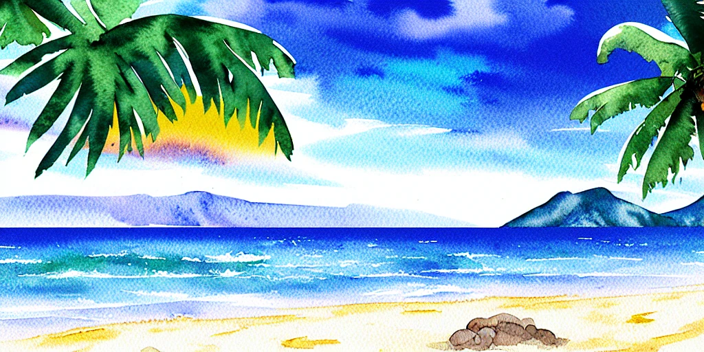 Tropical island beach, landscape view, crashing waves, Caribbean waters, steep mountains Hawaii, sunset sky, extra detailed, high definition, ocean bay, 10k, detailed watercolor