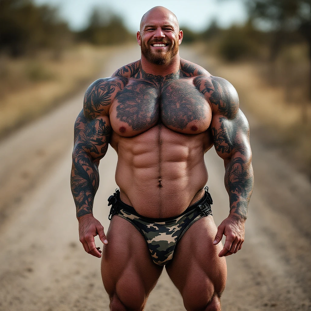 Full body image, tall fit bodybuilder, heavily tattooed, slim face, chiseled jawline, shaved head, huge penis bulge in camouflage print thong underwear, big feet in black combat boots, big smile, standing outside on dirt road