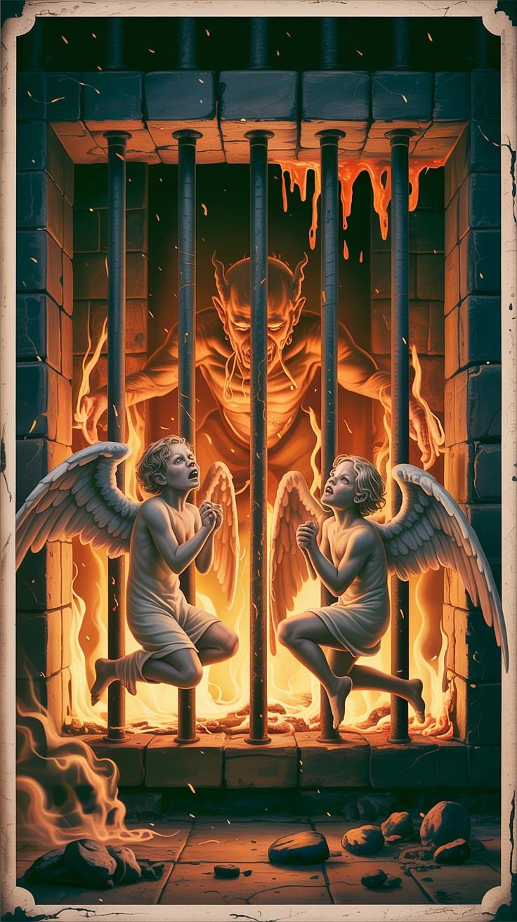 Vintage Poster, macroview of angels in hell prison, ultrarealistic mini people, angels, ultradetailed jail in flames theme, devil in jail background, damaged photo, 8K