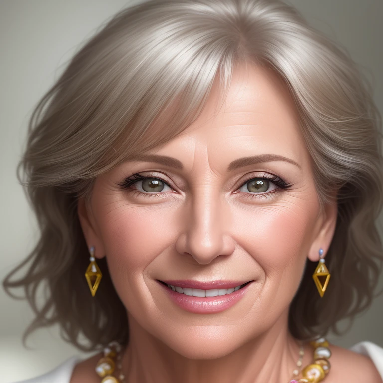 hyper realistic headshot photo of a 55 year old woman, expensive jewelry, looking into the camera, smiling slightly, Extreme Close-Ups, Full Frame camera, ISO: 32000 Aperture (f-stop) : f/16, Shutter Speed: 1/30, Camera Lens: 85mm prime lens, Camera Eye Line: Low, Studio Lightning, ultrarealistic, 8k