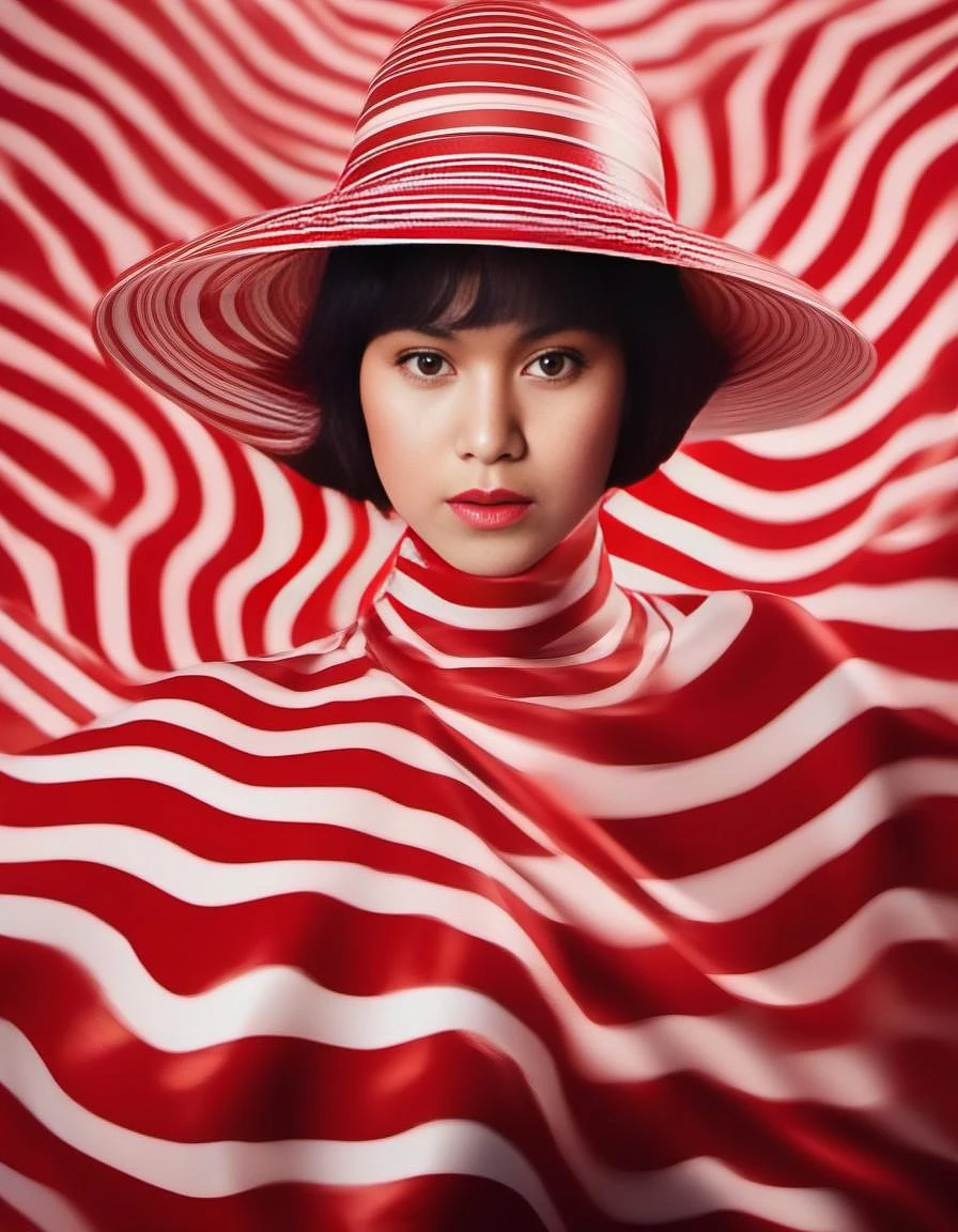 Extreme Wide Shot, Surreal scene of the striped form lady, emerging from lady Hat wavy striped liquid, let's add an element of fantasy. in white bridal gown, Chat Bubbles are covered around, intricate crystal circle patterns, vibrant red hues, majestic aura , detailed embroidery, fantasy setting, lavish presentation, surreal beauty, mesmerizing floral expanse, enchanting atmosphere, realistic, real, reality