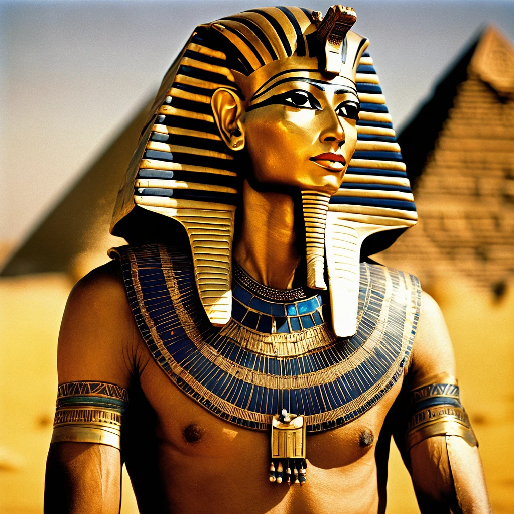 A regal 40-year-old figure, believed to be the reincarnation of an ancient Egyptian pharaoh, is adorned in elaborate pharaonic attire and jewelry. They stand amidst the grandeur of the Great Pyramids, captured in a mesmerizing portrait by an archaeology enthusiast photographer, 1923. The image is bathed in the golden light of the desert sun.
