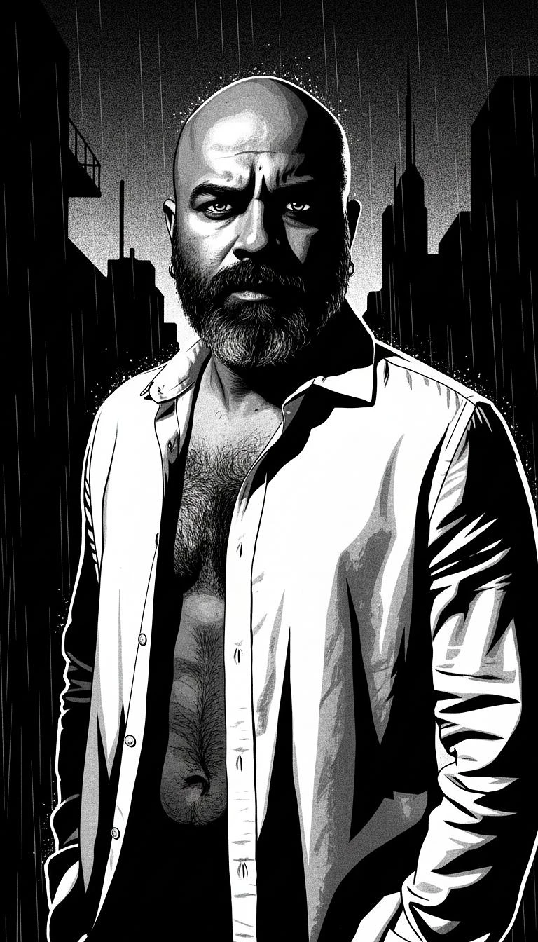 Create a dramatic, high-contrast portrait of a man in the iconic noir style of Sin City. The image should be predominantly black-and-white with deep shadows and sharp highlights, evoking a gritty, comic-book aesthetic. The woman’s face is partially illuminated, he has a fierce, determined expression, his eyes are intense, casting a shadow over one side of her face. The background is minimal but textured, possibly a rain-soaked alleyway or a city skyline in silhouette. The lighting should be stark, creating sharp, angular contrasts that emphasize her strong features and the overall noir tone.