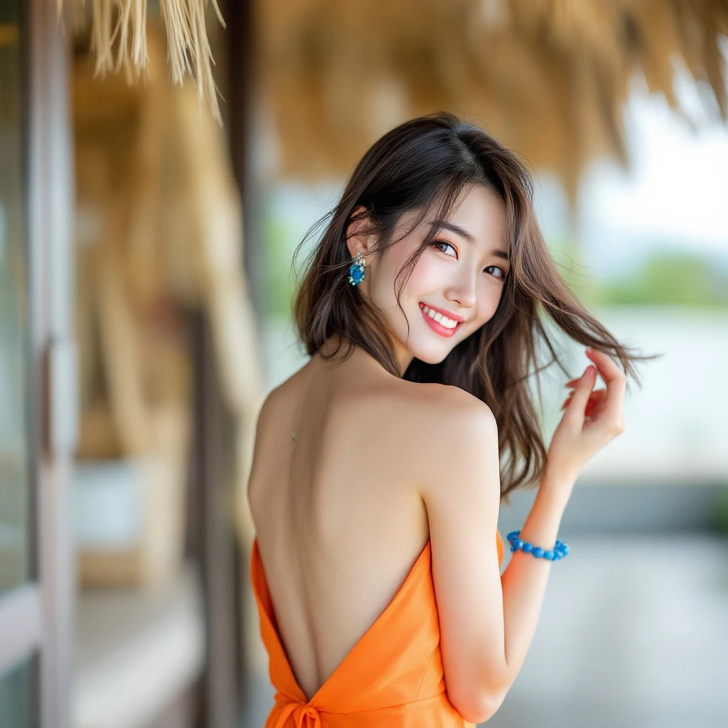 The photograph depicts a woman with a typical Japanese female artist face smiling cheerfully and wearing a beautiful backless orange dress. It appears to be an album cover and may have been inspired by the work of photographer Elsa Bleda. The dress is cute and features color blocking, a trendy fashion technique. This short dress is perfect for a woman's lounge, and the model is wearing blue jewelry to complement her dress. The model is showing a cute pose while flipping her hair. The photo was probably taken at a resort and was captured by talented photographer Julian Ope. The woman in the photo bears a resemblance to Japanese artist Yuri Ota or Miyawaki sakura.